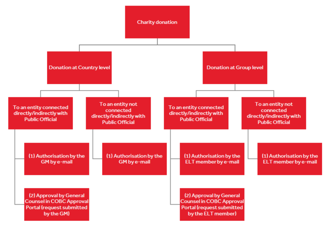 In addition to the approval of the Country General Manager (GM) or a member of the Executive Leadership Team (ELT), donations intended for Public Institutions or entities directly or indirectly connected to Public Officials must be approved through the CoBC approval portal by the relevant Ethics & Compliance Officer (the request may be submitted by the GM or the ELT member, or on their behalf).