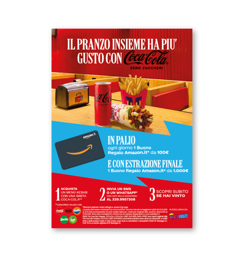 Possono partecipare al concorso tutti i maggiorenni residenti o domiciliati in Italia o nella Repubblica di San Marino, che dal 22 dicembre 2025 al 22 gennaio 2026, presso i punti vendita con insegna “Kebhouze”, acquisteranno un Combo Menù composto da un menù kebab con patatine (a scelta tra quelli disponibili nei punti vendita “Kebhouze”) + una bibita a scelta tra Coca-Cola Original Taste, Coca Cola Zero Zuccheri, Fanta, Sprite e FuzeTea in qualunque gusto e formato disponibile.Sono validi anche gli acquisti effettuati nei punti vendita con insegna “Kebhouze” tramite le applicazioni di food delivery.